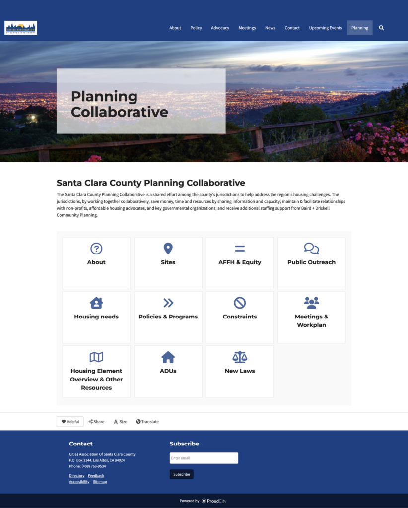 Since its inception in 2019, the Santa Clara County Planning Collaborative (SCCPC) has served as a countywide shared effort to advance housing policy and action among all 16 jurisdictions in the county, spanning from Palo Alto and south to Gilroy and encompassing the heart of Silicon Valley and the City of San Jose. SCCPC helps make developing high-quality, certified housing elements easier and less costly, and supports housing policy implementation across the County. SCCPC is a project of the Cities Association of Santa Clara County, and Community Planning Collaborative has helped support its formation as well as providing ongoing facilitation and technical support.