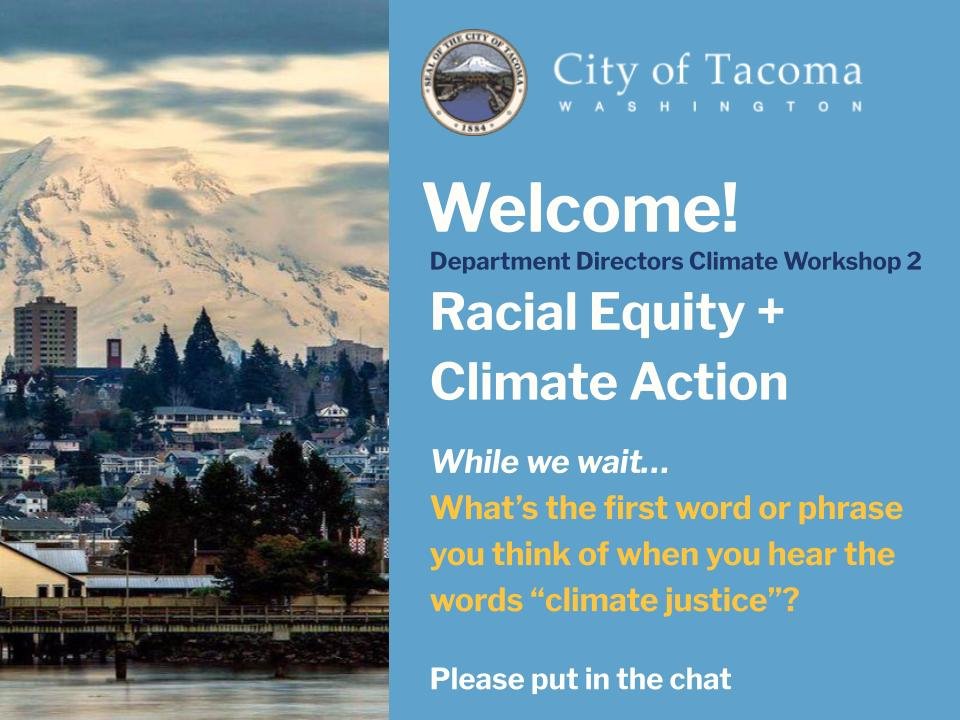 Working in partnership with Tacoma’s Sustainability Manager, we organized and led three training workshops for the city’s leadership team. The workshops were focused on developing a deeper understanding of projected climate change impacts in the city and region; evaluating potential impacts on city facilities, programs and operations; strategizing priority actions to reduce emissions and strengthen community resilience, particularly for low income communities of color; and delivering on the City Council’s priorities for climate action as well as health, safety, access and jobs. The three two-hour workshops—A Climate of Change; Equity in Climate Action; and Into Action!—included presentations from invited experts; a panel of guest speakers from peer cities; and a sequence of participatory exercises and conversations leading to departmental commitments for near-term action steps.